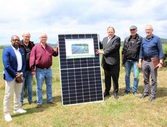 V.l. Laundry Bom, Jürgen Speier und Heinz Rücker vom VfL-Vorstand mit Christof Schwedes, Rüdiger Klein und Andreas Mankel von der 7x7 Unternehmensgruppe freuen sich auf den Solarpark, der mit Solarmodulen für sauberen Strom in Aßlar sorgt.