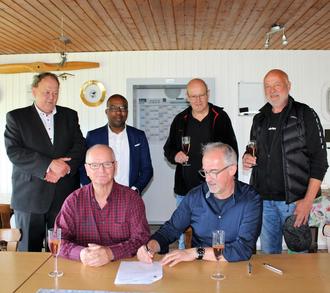 Heinz Rücker und Andreas Mankel unterschrieben den Vertrag und stießen mit v.l. Christof Schwedes, Laundry Bom, Jürgen Speier und Rüdiger Klein auf eine Erfolgsgeschichte an.
