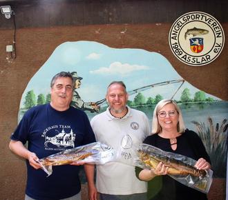 Vorsitzender Lars Klotz mit Nicole Benning und Rolf-Bernd Pfannkuchen, die beim Schätzen der Lachsforellen dem Gewicht am nächsten kamen.