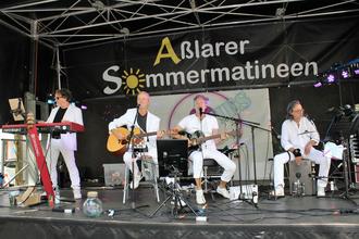 Bei den Aßlarer Sommermatineen gab es am Sonntag neue Gesichter auf der Bühne: "Back 2 The 80s" standen auf dem Programm und die vier Vollblutmusiker Stefan Ackermann (Gitarre/Gesang), Ralf Enzmann (Bass/Gesang), Roger Haberditzl (Drums/Gesang) und Dennys Sawellion (Piano/Gesang) versetzten ihr Publikum zurück in die Zeit von Zauberwürfel und Miami Vice. Mit ihrer bunten Mischung aus Pop, New Wave, Rock, Funk und Neuer Deutscher Welle ließen die Retro-Rocker die Kuh fliegen und brachten Stimmung auf den Platz. Auf seiner "Sky is the limit"-Tour 23 hat sich das klangstarke Kleeblatt vorgenommen, das Lebensgefühl dieser legendären Zeit auf die Bühne zu bringen. Mit "Here comes the sun" von den Beatles fiel der ultimative Startschuss für ein abwechslungsreiches Programm, das eine Menge zu bieten hatte. Ob "Sunny" von Boney M, das "Hotel California" der Eagles, Stevie Wonders "Sunshine of my live", "Volare" von den Gipsy Kings oder Carlo Santanas "Samba Pa Ti" - die Jungs haben es einfach drauf und kamen sehr gut an.