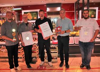 V.l. Die Metzger Dennis Gierhardt, Klaus Brinkmann, Rudi Krauss, Christian Schwarz und Natanail Chramas mit einem Teil der Preise.