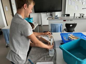 Wie in den vergangenen Jahren stand auch diesmal das Thema „Schwimmen und Sinken“ im Mittelpunkt. Ausgehend von der zielgerichteten Untersuchung typischer Schülervorstellungen, z.B. der Annahme, dass alle Gegenstände mit Löchern untergehen, wurde in weiterführenden Experimenten in Partnerarbeit der Zusammenhang zwischen Wasserverdrängung und Schwimmen thematisiert. Mit den älteren Schülern, zu denen auch die Klassen 8G der Alexander-von-Humboldt-Schule Aßlar mit ihren Lehrern Hans-Jörg Stengel, Andreas Fritsch und Oliver Heege gehörten, wurden überdies die auftretenden Kräfte untersucht. „Schön ist, dass die Lehrkräfte am Labortag alle Unterlagen erhalten, um das Thema im Unterricht vertiefend fortsetzen zu können“, lobten die Pädagogen. Ihre Schüler widmeten sich indes sehr motiviert den Experimenten.