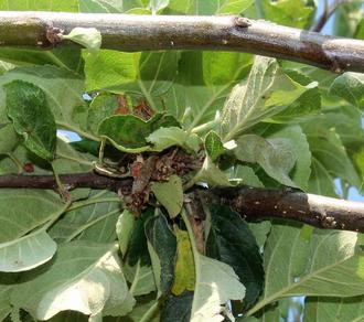 Begegnet man einer solchen Stelle im Apfelbaum, hat man den Apfelwickler auf frischer Tat ertappt.