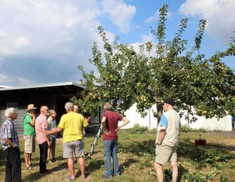 Der Sommerschnitt wird bei stark wachsenden Obstbäumen immer wichtiger. Er bremst das Wachstum, führt zur Bildung neuer Fruchttriebe und sorgt bei Äpfeln außerdem dafür, dass die vorhandenen Früchte besser ausreifen. Deshalb lädt der Obst- und Gartenbauverein Aßlar regelmäßig zu einem Sommerschnittkurs ein, um interessierten Baumbesitzern Rat und Hilfestellung zu geben. Am Samstag war es wieder soweit: Der erste Vorsitzende Armin Naumann freute sich über viele Teilnehmer und Baumwart Carsten Roth stellte zunächst die geeigneten Gerätschaften vor. Danach ging es an die Praxis, wobei auch die Gäste gefragt waren. Was jeder kann, ohne überhaupt eine Baumschere oder -säge in die Hand zu nehmen: Fruchtmumien und faule Früchte müssen unbedingt entfernt werden! Während beim Winterschnitt der Rückschnitt nach dem Laubabwurf während der Saftruhe das Wachstum anregt, bremst der Sommerschnitt die Wuchskraft und fördert dafür einen reichen Blüten- und Fruchtansatz. Dafür spricht auch, dass im Saftfluss stehende Bäume Wunden rasch verschließen und eindringende Pilzerreger oder Bakterien- und Virusinfektion abwehren können. Einen kräftigen Schnitt vertragen Apfel- und Birnbäume. Kurztriebe auf der Astoberseite kappt man bereits im Juni, indem man die zehn bis 40 Zentimeter langen, zukünftigen Fruchtäste dabei direkt über den an der Basis rosettenartig angeordneten Blättern abschneidet. Noch nicht verholzte, längere Jungtriebe reißt man dann mit einem kräftigen Ruck aus (Juniriss/Juniknip). Der eigentliche Sommerschnitt für Apfelbäume, bei dem wie üblich alle zu dicht stehenden oder nach innen und oben wachsenden Langtriebe ausgelichtet werden, erfolgt im August, wenn die Endknospen an den Triebspitzen voll entwickelt sind. Natürlich wurde so geschnitten, dass nicht zu viel Obst verloren geht. Allerdings werfen die brechend vollen Obstbäume in diesem Jahr ohnehin schon Ballast ab, weil durch die Trockenheit gar nicht alle Früchte bis zur Vollreife getragen werden können. Trotzdem gab es Einiges zu schneiden, wie zum Beispiel Spitzen von Ästen, die keine Früchte tragen. Bei der Arbeit kann man übrigens dem Apfelwickler begegnen. Es handelt sich hierbei um einen Nachtfalter, dessen Raupen im Obstbau als Schädlinge angesehen werden. Die geschlüpfte Raupe frisst sich über die Fruchtspitze oder direkt in die Frucht zum Kerngehäuse vor. Zuerst legt sie einen spiralförmigen Gang an und dringt anschließend direkt zum Fruchtinnern ein. Schließlich ernährt sie sich vom Kernhaus mitsamt den Samen (Kernen). Beim Fressen wird der Kot in der Form von Mehl ähnlich gemahlenem Kaffee über die Eintrittsstelle ausgeschieden und entsorgt. Es gibt zwar chemische Maßnahmen gegen die gefräßigen Raupen, gegen die manche Arten aber auch schon resistent sind. Deshalb sollte man natürliche Gegenspieler wie Ohrwürmer (findet man häufig in den Fraßgängen der Apfelwicklerlarve), Wanzen und Schlupfwespen unterstützen. Die Raupen stellen auch eine willkommene Nahrung für Vögel dar. Alle Maßnahmen, die diese Nützlinge fördern, tragen zur Regulierung des Schädlings bei. Beim Austausch während des Schnittlehrgangs kann man immer etwas Neues erfahren, den Fachleuten gezielt Fragen stellen und Erfahrungen austauschen.