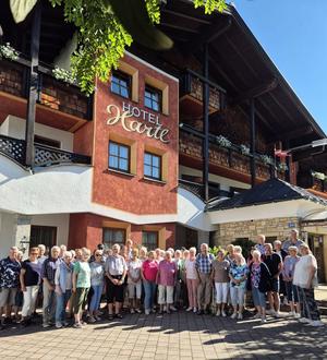 Die diesjährige Mehrtagefahrt des Obst- und Gartenbauvereins Aßlar führte 46 Gartenbaufreunde ins Salzburger Land. Das Reiseziel war Flachau im Pongau, wo die Reisegruppe im familiär geführten Hotel Hartl eine entspannte, angenehme Verwöhn-Atmosphäre erlebte. Ausgezeichnete Verpflegung und gutes Wetter boten eine hervorragende Grundlage für das gute Gelingen der Urlaubstage. Mit einem ortsansässigen Reisebegleiter wurde eine ganze Menge über Kultur, Sehenswürdigkeiten und Geschichte Österreichs in Erfahrung gebracht. Bei der Tauernrundfahrt mit Naturpark Riedingtal erfuhren die Aßlarer, dass der Lungau das österreichische Sibirien genannt wird. Auch das mittelalterliche Städtchen Mauterndorf lag auf der Strecke. In der Kirche von Zederhaus durfte die Reisegruppe eine Einmaligkeit, nämlich die aus 40.000 Blüten gebundenen bis zu 8 m hohen Prangstangen, die am Johannistag bei einer feierlichen Prozession von unverheirateten Männern durch den Ort getragen werden, bewundern. Im Naturpark Riedingtal lud die Schlierer Alm zu einer Verweilpause ein und ein Rundgang durch die malerische Landschaft rund um den See krönte diesen Tagesausflug. Bei der Hochkönigrundfahrt wurde das Pitztal durchfahren und die größte Bogenbrücke konnte bestaunt werden. Durch das Salzachtal ging die romantische Tour durch die wunderschöne Bergwelt. Auf der Paul Außerleitner Schanze in Bischofshofen sorgten die Nachwuchs-Skispringer der österreichischen Nationalmannschaft mit ihrem Training für eine bleibende Erinnerung. Einen spaltenlosen Gletscher am Nordhang des Hochkönigstocks nennt man einer Sage nach "die übergossene Alm". Nach kurvenreicher Auffahrt zur Arturhütte auf 1500 Meter am Fuße des Hochkönigs zeigte sich auf der Wanderung zur Murmeltierwiese leider nur ein einziger dieser possierlichen Gesellen. Anschließend konnte das schöne Städtchen Zell am See erkundet werden oder auch ein Spaziergang an den See war möglich. Im urig-rustikalen "Musistadl", einer alten Scheune, die in Kärnten abgetragen und in Flachau wieder original aufgebaut wurde, freuten sich die Aßlarer über ein reichhaltiges Abendessen und der lustige Österreich-Abend mit Schuhplattler und allem drum und dran rundete das Programm an diesem Tag ab. Durch das Engtal der Salzach, auch Pass Lueg genannt, begann die Panoramafahrt Mondsee/ Wolfgangsee. Durch zwei Tunnel verließ die Reisegruppe den Tennengau. Das Wiestal ist ein Erholungsgebiet mit vielen Stauseen. Vorbei an blumengeschmückten Bauernhäusern und einzigartiger Landschaft ging die Fahrt in Fuschl am See an der Red Bull Zentrale vorbei. In Mondsee ließ die Gruppe die einmalig schöne und sehr bekannte Basilika St. Michael auf sich wirken. Von St. Gilgen bis St. Wolfgang freuten sich alle über eine schöne Schifffahrt. Angekommen in St. Wolfgang war natürlich der erste Anlaufpunkt das berühmte "Weiße Rössl am Wolfgangsee". Am vierten Abend der abwechslungsreichen Reise sorgten die "Steidl Buam" für Musik und Tanz im Hotel. Am letzten Tag erreichte die gutgelaunte Gruppe über enge Wege Filzmoos mit der Oberhofalm und der Erlebnisalm Unterhofalm. Bei traumhaft schönem Wetter war man begeistert von dem unvergleichlichen Panoramablick auf die Alpenlandschaft. Ein besonderes Highlight war der Rundwanderweg, der von der Unterhofalm über den Almsee zur Oberhofalm führt. Dieses einmalig schöne Bergwelterlebnis dürfen die Aßlarer als Krönung zum Abschluss ihrer diesjährigen Reise in Erinnerung behalten. Gemütlich klang der Sonnentag mit einem freien Nachmittag aus. Das Reiseteam mit Annemarie und Armin Naumann konnte der netten Reisegruppe viele schöne Erlebnisse und Eindrücke in der stein-, kurven-, wald- und wasserreichen Gegend mit wildromantischen Wasserfällen und traumhaft schöner Bergwelt bieten. Ziel der Mittagspause auf der Heimfahrt war das Hotel "Zum Fuchswirt" in Allershausen. Die schönen Tage im Salzburger Land vergingen viel zu schnell.