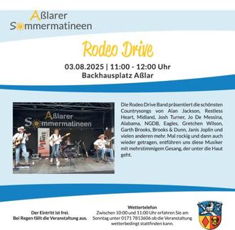 Die Rodeo Drive Band präsentiert die schönsten Countrysongs von Alan Jackson, Restless Heart, Midland, Josh Turner, Jo De Messina, Alabama, NGDB, Eagles, Gretchen Wilson, Garth Brooks, Brooks & Dunn, Janis Joplin und vielen anderen mehr. Mal rockig und dann auch wieder getragen, entführen uns diese Musiker mit mehrstimmigem Gesang, der unter die Haut geht.