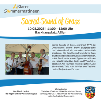 Sacred Sounds Of Grass, gegründet 1979, ist Deutschlands älteste aktive Bluegrass-Band und international als besonders authentisch anerkannt. Die Band beeindruckt durch ihren akustischen Sound und musikalische Perfektion, spielt Traditionals sowie Eigenkompositionen und hat zahlreiche Live-Radio- und TV-Auftritte absolviert. Auf Tourneen wurde sie gefeiert, und 1998 erhielt Thilo Hain in Wien den Titel des besten Banjospielers Europas.