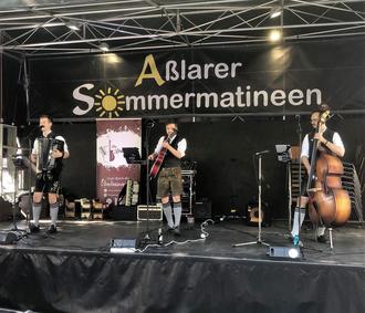 Bei den Aßlarer Sonntagsmatineen gab es jetzt auf dem Backhausplatz ein "Stelldichein in Oberkrain" vom Allerfeinsten. Das Trio "Krainerlogie" spielte auf und Dominik Focks, Fabian Planks und Alexander Weißbecker hatten ihr Publikum von Anfang an in der Hand. Der Oberkrainer Rhythmus liegt den jungen Männern im Blut und der Funke sprang schnell über. Das Publikum lauschte gebannt den Klängen von Akkordeon, Steirischer Harmonika, Gitarre und Kontrabass und ließ sich gerne mitreißen. "Es ist so schön, ein Musikant zu sein" - das nahm den Dreien jeder ab, die ihre Zuhörer schwindelig spielten. Die "Wigel Wogel Polka", "Am Steilhang", das "Mädel aus Krain" oder "Hey Slavko" - viele der altbekannten Avsenik-Hits gehörten zum Repertoire, aber auch noch eine Menge weitere Titel begeisterten die Zuhörer restlos. Man musste kein Oberkrainerfan sein - diese Musik reißt einfach mit und sorgt für eine rundum entspannte Atmosphäre.