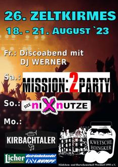 Kirmesumzug ab 14 Uhr mit anschließender Party im Festzelt mit „Die Nixnutze“