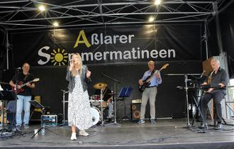 Ganz andere und doch sehr bekannte und beliebte Töne gab es bei den Aßlarer Sommermatineen, als jetzt die Band "Color Notes" die Bühne auf dem Backhausplatz eroberte. Die Temperaturen waren nach heißen Tagen zwar noch frisch, doch Hannah Kurz (Gesang), Bert Gocke (Gitarre), Julian Kümmel (Keyboard, Saxophon), Dirk Metzger (Bass) und Thomas Schlitt (Schlagzeug) sorgten dafür, dass sehr schnell eine heiße Atmosphäre das Publikum auf die richtige Temperatur brachte. Eine Mischung aus Latin Jazz, Smooth Jazz und Popmusik reihte Welthit an Welthit und schnell stand fest: Diese Band lebt ihre Musik, ergänzt sich perfekt und bringt die Titel in ihrem ganz eigenen Sound. Gershwins "Summertime" erinnerte an Ella Fitzgeralds Bestzeit, der "Smooth operator" der Band Sade führte temperamentvoll weiter und spätestens bei Bobby Hebbs "Sunny" war das Publikum begeistert dabei. Die Akteure auf der Bühne spielten sich mit ihrem Programm in die Herzen der Zuhörer*innen - die Auswahl war perfekt. "Rio de Janeiro Blue", das Joe Sample und Randy Crawford ins Spiel brachte, Nicole Bunouts "Mananas del Sol" und auch "Chan Chan" das Compay Segundo und der Buena Vista Social Club den Fans dieser Musik schenkte, ließen Gänsehaut aufkommen. Die eigenen Arrangements der Titel gaben der Sache den besonderen Kick. Covern kann jeder, aber sein eigenes Ding aus einem bekannten Stück machen, dazu gehört schon eine gute Portion Können und natürlich die Liebe zu dieser Musik. Miley Cyros "Flowers" gingen da genauso ins Ohr, wie die "Super duper love" von Joss Stone, Consuelo Velasquez' "Besame Mucho" oder Bill Withers "Lovely Day". Perfekter Abschluss war nach dem "Game of love" von Santana dann als Zugabe Jimmy Cliffs "I can see clearly now", der einen "bright sunshiny day" verspricht. Längst wärmte die Sonne und der Kirmessonntag bei Kaiserwetter ließ gute Stimmung erwarten. Leider gehen die Sommermatineen am kommenden Sonntag mit der "Dicke Backe Attacke" auch schon wieder zu Ende.