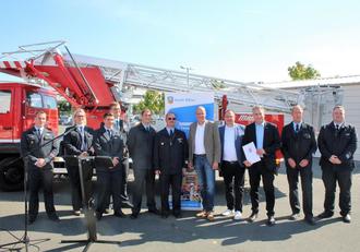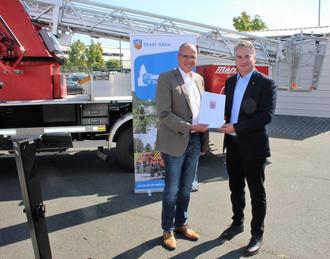 Innenminister Peter Beuth kam persönlich zum Gerätehaus, um einen Förderbescheid in Höhe von 186000 Euro für die neue Drehleiter DLAK 23/12 zu übergeben. Bürgermeister Christian Schwarz hieß neben Beuth Vertreter der Aßlarer Kommunalpolitik mit 1. Stadtrat Dr. Stefan Zabeschek, Stadtverordnetenvorsteherin Katharina Schäfer und Ehrenamtsdezernentin Edith Muskat an der Spitze, der Feuerwehr um Stadtbrandinspektor Michael Pichl sowie der Stadtverwaltung willkommen. "Unsere aktuelle Drehleiter stammt aus 1994 und entspricht nicht mehr den aktuellen Anforderungen und Vorgaben", so der Bürgermeister. "Es werden immer höhere Gebäude gebaut und auch unser Ziel, die Feuerwehr für effizienten Brand- und Katastrophenschutz mit vernünftigem Gerät auszustatten, können wir damit nicht mehr erreichen." Schwarz' Dank ging an die Stadtverordnetenversammlung, die bereits in 2021 entsprechende Haushaltsmittel in Höhe von 750000 Euro bereit stellte. "Nach ersten Gesprächen in der Ausschreibung werden es wohl sogar 780000 Euro - ein ordentlicher, weshalb wir froh über die Zuwendung sind. Auch die Aßlarer Gewerbetreibenden beteiligen sich, wie Egbert Reitz, der zu seinem 60. Geburtstag demnächst statt Geschenken um Geld für die Feuerwehr bittet. "Brandschutz ist eine gesamtgesellschaftliche Aufgabe", unterstrich Schwarz und gab dem Minister einen Appell mit nach Wiesbaden: "Die Förderrichtlinien gehen von 620000 Euro Kosten aus, so dass die Förderung schlussendlich nicht bei 30 sondern nur bei 23,85 Prozent liegt. Es wäre schön, wenn das angepasst würde." Außerdem hätte Aßlar eine Förderung von 40 Prozent zugestanden, weil das Fahrzeug auch in Nachbarkommunen zum Einsatz kommt. "Weil wir gut gewirtschaftet und einen Haushaltsüberschuss von 1,3 Millionen Euro als Rücklage haben, wurden uns 10 Prozent abgezogen, was in diesen Zeiten nicht gerade motiviert", so Schwarz.