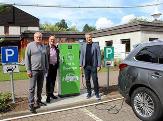 Seit vergangener Woche gibt es am Aßlarer Rathaus einen öffentlichen Ladepunkt für Elektrofahrzeuge. "Unser städtischer Fuhrpark hat immer mehr Elektrofahrzeuge, so dass zu den zwei bisherigen Ladepunkten ein weiterer kommen sollte und wir sind dabei auch er Nachfrage nach einem öffentlichen Ladepunkt nachgekommen", erläuterte Bürgermeister Christian Schwarz bei der offiziellen Inbetriebnahme vor dem Rathaus. Die linke Ladesäule mit dem blauen Schild ist die öffentliche, am rechten Ladepunkt mit dem grünen Schild können nur städtische Fahrzeuge aufgeladen werden. Lieferant von 100 Prozent Ökostrom ist die EAM. "Man schließt einfach das Ladekabel an die Ladesäule an, hält seine Ladekarte vor das Lesegerät und der Ladevorgang wird automatisch gestartet ", erläuterte Uwe Assmann vom Fachbereich Bauen, der die Realisierung bearbeitet hat. Ab sofort kann also jeder in der Zeit, wo er im Rathaus oder in der Stadthalle zu tun hat, gleichzeitig sein Auto aufladen.