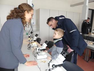So konnten die Gäste beim Fachbereich Geschichte eine Zeitreise in die 20er-Jahre machen. Die Spielstationen der Sportler erforderten Geschicklichkeit, während beim Gestalten von Buttons bei den Anglisten und dem Masken Basteln der Künstler Kreativität gefragt war. „Kleines ganz groß“ hieß es im Biologieraum, wo Mikroskope und Stereolupen aufgebaut waren. Schöne Farbeffekte gab es im Chemieraum bei den Versuchen mit Rotkohlsaft und auch die Physiker luden zum Experimentieren ein.