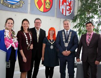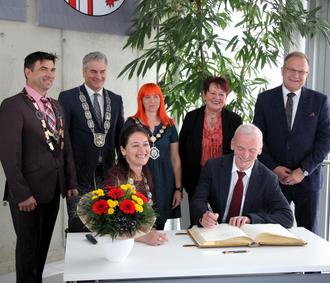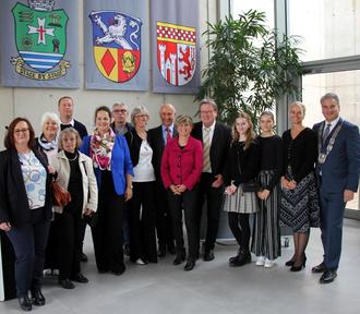 Larissa Weber, Bürgermeisterin von Waldbröl, hieß zum Festakt am Tag der Deutschen Einheit neben Vertretern aus Waldbröls Partnerstädten Jüterbog, Witham (England) und Świebodzice (Polen) auch eine Abordnung aus Aßlar im Bürgersaal willkommen. Seit vielen Jahren feiern die drei deutschen Partnerstädte diesen Tag gemeinsam im jährlichen Wechsel. So begrüßte Weber nicht nur ihre Amtskollegen aus den Partnerstädten - Lucy Barlow aus Witham in der englischen Grafschaft Essex, Arne Raue aus Jüterbog in Brandenburg und Pawel Ozga aus dem polnischen Świebodzice - sondern auch Christian Schwarz. Mit dabei als offizielle Vertreter für Aßlar die Stadtverordnetenvorsteherin Katharina Schäfer, Jan Guckenbiehl als Vorsitzender des Partnerschaftsausschusses und Vertreter des Vereins "Aßlar Partner in Europa" mit Roland Esch an der Spitze. " Freundschaft über Grenzen hinweg ist sehr wichtig - damit hat dieser Vereinigungstag eine historische Bedeutung für ganz Europa", unterstrich Weber. Wie wichtig allen Anwesenden die Deutsche Einheit ist, brachte Festredner Jochen Gran, Waldbröler Pfarrer im Ruhestand, am Ende seiner Ansprache auf den Punkt: "Wir haben dieses Wunder erleben dürfen!" Er hatte zu Beginn Willy Brand zitiert, der damals voller Enthusiasmus sagte "Jetzt wachse zusammen, was zusammengehört!" Auch wenn "die Freude und Ungezwungenheit von damals" verloren scheint und Begegnungen zwischen Ost und West immer noch etwas Ungewohntes haben, hat der Theologe noch Hoffnung: "Am Ende stellen wir fest, dass wir alle einfach nur Menschen sind." Damit sprach er wohl allen aus dem Herzen, denn jeder Bürgermeister wusste recht persönliche Verbindungen beizutragen. Jüterbogs Bürgermeister Arne Raue hatte sich in einem Gespräch mit seiner Tochter erinnert, wie hoch das Gut der Freiheit und Meinungsfreiheit doch zu werten ist, weshalb es wichtig sei, das Geschenk der Einheit in die nächste Generation zu tragen. Pawel Ozga aus Świebodzice bedeuten Einheit und Städtepartnerschaften so viel, dass er trotz der Überflutungen in seiner Region zu der Feier gekommen war. Lucy Barlow war schon mit dreizehn mit ihrem Vater Phil in Waldbröl: "Und heute bringe ich meine Kinder mit." Christian Schwarz erinnerte sich an einen Besuch in Ostdeutschland kurz nach der Wiedervereinigung: "Ich habe damals gedacht, dass die anstehenden Veränderungen nicht zu schaffen sind, doch wenn wir uns heute auf dieser Ebene verständigen, wird mir nicht bang ums Herz." Das Glück der Wiedervereinigung sei Verpflichtung für die Zukunft. Nach der Europahymne und der Nationalhymne, die vom Schulchor und dem Streichquartett des Hollenberggymnasiums vorgetragen wurden, trugen sich alle Redner in das goldene Buch der Stadt Waldbröl ein. Da auch zahlreiche Wegbereiter und Macher der 34 Jahre Einheit gekommen waren, die längst eine feste Freundschaft verbindet, gab es beim anschließenden Zusammentreffen im Foyer viel zu erzählen. Noch mehr Gelegenheit zum Austausch gab das Rahmenprogramm, das der Partnerschaftsverein um Marianne Pfeiffer auf die Beine stellte.