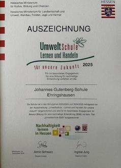 Die Landeskoordinatorinnen der Umweltschulen, Simone Schweikhard und Gabriele Schaar von Römer, hatten zusammen mit den regionalen Beratungszentren nach Hanau eingeladen, um Hessische Umweltschulen zu würdigen. Staatssekretär Dr. Manuel Lösel vom Kultusministerium und Staatssekretär Michael Ruhl vom Ministerium für Landwirtschaft und Umwelt betonten in ihrer Ansprache die Bedeutung heutiger Umweltschulen und wie wichtig das gemeinsame Lernen und Handeln für eine gemeinsame Zukunft ist. Mit der Auszeichnung werden Schulen geehrt, die sich aktiv für ökologische, soziale und ökonomische Nachhaltigkeit einsetzen und dabei die gesamte Schulgemeinschaft einbeziehen. „Nachhaltigkeit im Biologieunterricht ist ein wichtiges und aktuelles Thema, das Schülern hilft, ökologische Zusammenhänge zu verstehen und verantwortungsbewusstes Handeln zu fördern. Für uns ein Selbstverständnis, das Tag für Tag nicht nur theoretisch, sondern auch sehr praxisnah gelebt wird“, ordnet Fachleiterin Simone Strauß-Schwabe die alltägliche Unterrichtsarbeit der JGS dahingehend ein. Letztlich war es dann nur noch ein kleiner Schritt zur offiziellen Bewerbung, um in den Kreis der Umweltschulen aufgenommen zu werden. Die Lehrkräfte wählten zwei Projekte aus, die besonders herausragend für den Nachhaltigkeitsgedanken stehen. Mit Sandarium, Insektenhotels sowie Früh- und spätblühende Staudenbeete wird das Prädikat „Insektenfreundliche Schule“ besonders untermauert, während durch die Kooperation mit der Gemüse-Ackerdemie schulische Hochbeete und Beetflächen bearbeitet werden, um dem Anspruch „Hier wächst Wissen“ gerecht zu werden. „Beide Projekte fördern das Lernen mit allen Sinnen, was nicht nur unterschiedliche Lerntypen gleichermaßen anspricht, sondern auch den Biologieunterricht lebendig, erfahrbar und nachhaltig macht. Unsere Schule verfolgt mit dem Engagement der insektenfreundlichen Ausrichtung das Ziel, Bildung für nachhaltige Entwicklung (BNE) im Unterricht sowie im gesamten Schulalltag zu verankern, damit die Aussage des deutschen Physikers und Nobelpreisträgers nicht Realität wird und dass dieser Einsatz nun mit der Auszeichnung als Umweltschule gewürdigt wird, ist für uns eine ganz tolle Sache“, so Schilling abschließend.
