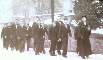 Pfarrer Henn mit Konfirmanden auf dem Weg zur Kirche.