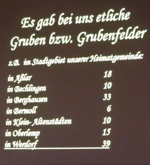 Mit dem Vortrag "Der Bergbau und die Eisenverhüttung in den historischen Grenzen von Werdorf" hat Paul Djalek die Reihe der Nachholveranstaltungen zur 1250-Jahrfeier in Werdorf fortgesetzt. Der Saal des Dietrich-Bonhoeffer-Hauses war gut gefüllt mit Zuhörern, die gespannt den Ausführungen folgten und Fragen stellten. Der gebürtige Werdorfer interessiert sich schon seit Kindesbeinen für das Thema und forscht seit mehr als 20 Jahren in zahlreichen Quellen. Mit den bemerkenswerten Details und Erkenntnissen in seinem reich bebilderten Vortrag, den er mit einem kurzen Ausflug durch die Erdzeitalter begann, überraschte er so manchen. "Die Lagerstätten unserer Heimat sind submarin vor ca. 370 Millionen Jahren südlich des Äquators entstanden", war denn auch die erste kaum vorstellbare Aussage. Wir leben heute auf dem Meeresboden, auf dem so genannte "Black Smoker" die verschiedensten metallischen Lösungen aus dem Erdinneren spieen, die über Jahrmillionen zu Lagerstätten für den späteren Bergbau wurden. Im "alten" Bergrevier Wetzlar, das den Kreis Wetzlar und einen Teil des südlichen Kreises Biedenkopf umfasste, gab es um 1878 ca. 1300 verliehene Grubenfelder. 131 dieser Gruben befinden sich im heutigen Aßlarer Stadtgebiet. 39 davon lagen oder liegen in den heutigen Gemarkungsgrenzen von Werdorf. Djalek erzählte von den Kohlemeilern in den Wäldern, die Brennstoff für die Rennöfen lieferten, mit denen das Erz vor Ort geschmolzen und in Waldschmieden verarbeitet wurde. Thematisiert wurden auch die Ausgrabungen bei Dalheim, die im Rahmen des Ausbaus der B 49 durchgeführt wurden. An dem bis dahin unbeachtet gebliebenen Eisenrevier konnte modellhaft die Entwicklung der Eisengewinnung in einer Altsiedellandschaft des Mittelgebirgsraumes studiert werden, wobei unerwartet erstmals Nachweise einer Produktionsstätte aus der Eisenzeit möglich waren. Für den Transport waren wohl zunächst die alten Handelswege wichtig. Nicht nur in Dalheim war eine Station - auch Aßlar gehörte dazu und der älteste schriftliche Hinweis auf den Bergbau in Deutschland weist auf unsere Gegend hin. "Hier wurde Wanendorf zwischen Solms und dem Wetzbach gelegen genannt", so Djalek, der die Namen aller Werdorfer Gruben von "Antonia", über "Heinrichssegen" und "Jacobshoffnung", bis hin zu "Vertrauen", "Louishoffnung" oder "Neuglück" und "Kleiner Jacob" nannte, die durchaus beachtliche Mengen hergaben.