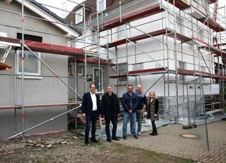 Im Zuge der Bauarbeiten wurde auch gleich die Fassade des Bestands erneuert und v.l. Nils Neidhart, Christian Schwarz, Rupert Senzel, Christof Müller und Karina Walther freuen sich über den zügigen Fortgang.