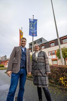 Bürgermeister Christian Schwarz und Gleichstellungsbeauftragte Stephanie Stahl vor der gehissten Fahne am Rathaus Aßlar.