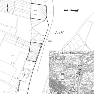 Die Flächen der beiden Geltungsbereiche liegen im Flur 29 nordöstlich der Stadt Aßlar, nahe und nordöstlich des Umspannwerkes, in nördlicher Verlängerung der Loherstraße. Die Autobahn A 480 liegt fast direkt angrenzend in östlicher Richtung.