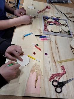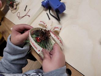 Zunächst wurden mit Hilfe von Maschinenbauer Dominik Noß mittels einer Dekupiersäge Herzen aus Holz ausgeschnitten, die zusammen mit Goetheschülerin Julia Küster weihnachtlich gestaltet wurden. Mit Heißkleber brachten die Kinder Beeren, Zweiglein, Blätter und bunte Bänder auf die hergestellten Herzen auf. Bereits das Ausschneiden trainiert sowohl die Fingerfertigkeit und Feinmotorik.