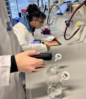 Nach ihrer Ankunft wurden die Schülerinnen und Schüler von Professorin Dr. Nicole Graulich aus dem Fachbereich „Didaktik der Chemie“ und ihrer Arbeitsgruppe herzlich empfangen und nach einer kurzen Einführung und den wichtigen Sicherheitshinweisen ging es dann direkt ins Labor. Ausgestattet mit Laborkitteln, Schutzbrillen und iPads mit Wärmebildkameras konnten die jungen Nachwuchsforscher dann selbst aktiv werden. In Partnerarbeit führten sie anschließend spannende und interessante physikalische sowie chemische Experimente durch.