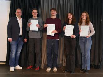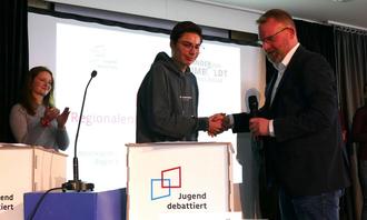 Zur Freude von Jonas Falk, Stufenleiter und Lehrer für Politik und Wirtschaft an der Alexander-von-Humboldt-Schule, hatte sich mit Humboldt-Schüler Leon Schmidt ein aussichtsreicher Kandidat für die Finalrunde qualifiziert, die er mit Hannah Fink vom Landgraf-Ludwigs-Gymnasium in Gießen, Konstantin Pausch von der Wetzlarer Freiherr-vom-Stein-Schule und Lore Schönwetter vom Gymnasium Philippinum Weilburg bestritt. Im freien Argumentieren überzeugte der Aßlarer Neuntklässler die Jury und konnte sich bei der Siegerehrung, bei der es nicht nur Urkunden und Gutscheine, sondern auch ein persönliches Feedback gab, über seinen zweiten Platz freuen.