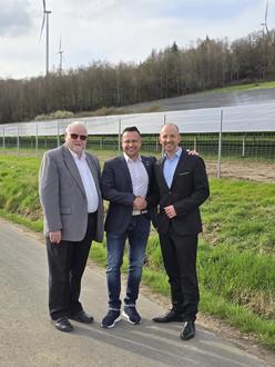 Von rechts: Bürgermeister Dominik Brasch, Thorsten Eurich (Geschäftsführer der Next Energy GmbH) und Erster Stadtrat Werner Wolf vor dem Photovoltaikpark in Salmünster