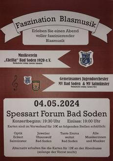 Am 04.05.2024 findet ab 19:30 Uhr das Jahreskonzert des MV „Cäcilia“ Bad Soden 1920 e.V. im Spessart Forum Kultur statt.