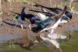 Mehlschwalben verbauen bis zu 1500 gut klebende Lehmklümpchen. Ihre Nester hängen oft an Hauswänden unterhalb von Dachvorsprüngen. (Foto: Axel Aßmann)
