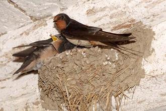 Früher ein häufiges Bild: Rauschwalben, erkennbar am roten Latz, in einem halboffenen Nest im Stall. (Foto: Frank Grawe)