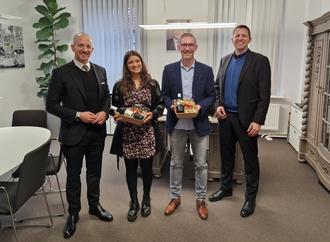 Bürgermeister Dominik Brasch (links) und Hauptamtsleiter Dominic Imhof (rechts) gratulieren Aysel Kara und Michael Salomon zur bestandenen Prüfung als Verwaltungsfachwirte.