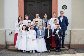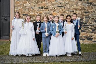 Am Sonntag, den 23.04.2023 traten in der Pfarrkirche St. Franziskus in Romsthal, 9 Kinder zum ersten Mal zum Tisch des Herrn. Zu Beginn des Gottesdienstes zogen die Kommunionkinder, gemeinsam mit den Messdienern und Pfr. Sippel in die Kirche ein. Im Anschluss durften die Kinder ihren Glauben selbst bekennen, den zuvor bei der Taufe ihre Eltern und Paten für sie bekannt haben. Als Rückenstärkung für dieses Glaubensbekenntnis, standen ihre Paten direkt hinter ihnen.