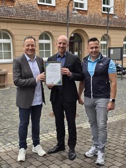 Urkundenübergabe an Bürgermeister Dominik Brasch als ersten Kunden des Regionalstromtarifes für Bad Soden-Salmünster (von links: Thomas Ott (Projektleiter next energy, Bürgermeister Dominik Brasch, Geschäftsführer Torsten Eurich)