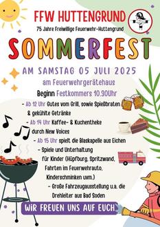 Am Samstag, den 05.07.2025 findet das Sommerfest der Freiwilligen Feuerwehr Huttengrund e.V. am Gerätehaus in Romsthal statt. Hierzu möchten wir die gesamte Bevölkerung sowie unsere benachbarten Feuerwehren herzlich einladen.