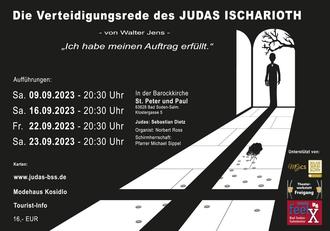 Am 9. September 2023 wird das Theaterprojekt "Die Verteidigungsrede des Judas Ischarioth" in der Barockkirche St. Peter und Paul in Bad Soden-Salmünster Premiere feiern. Der fiktive Monolog basiert auf dem Werk "Ich, ein Jud" des bekannten deutschen Schriftstellers und Literaturwissenschaftlers Walter Jens.