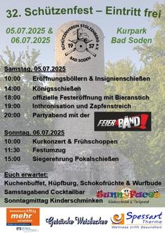 Kommt vorbei zu unserem Schützenfest in den Kurpark von Bad Soden! Unser Traditionsfest findet nur alle 2 Jahre statt, deshalb wäre es schade, wenn ihr es verpasst! Wir freuen uns auf jeden Einzelnen von euch!
