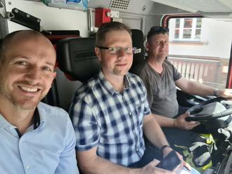 Um auf diesen Umstand aufmerksam zu machen, wurde kürzlich eine Befahrung mit dem Drehleiterfahrzeug der Feuerwehr im Stadtgebiet unter Teilnahme von Bürgermeister Dominik Brasch und Christian Buhl durchgeführt. Gesteuert wurde die Drehleiter durch den Bediensteten des städtischen Bauhofes Tobias Koch.