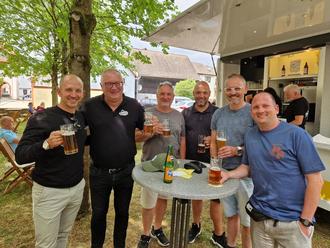 Bürgermeister Dominik Brasch (l.) und Michael Graf, Geschäftsführer der KINZZ Brauerei (2.v.l.) begrüßen die ersten Gäste im neuen Pop-Up-Biergarten im historischen Schleifrashof in der Altstadt von Salmünster.