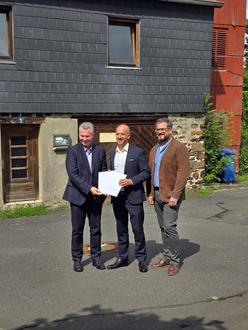 Bescheidübergabe durch Andreas Hofmann (links) an Bürgermeister Dominik Brasch (mitte). Mit anwesend war auch Johannes Michel (Abteilungsleiter Amt 70)