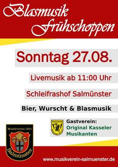 Am Sonntag, den 27.08.23 veranstaltet der Musikverein 1921 Salmünster e.V. wieder seinen beliebten Blasmusikfrühschoppen. Unter dem Motto "Bier, Wurscht und Blasmusik" sind die Freunde der gemütlichen Unterhaltung herzlich in den Schleifrashof Salmünster eingeladen.