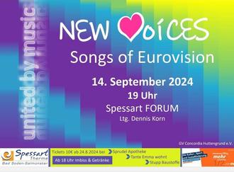 Am 14. September 2024 im Spessartforum ist es endlich soweit! Die Sängerinnen von New Voices unter der Leitung von Dennis Korn nehmen euch mit auf eine musikalische Reise durch die letzten Jahrzehnte des Eurovision Song Contests. Genießt nicht nur die mitreißende Musik, sondern auch besondere Leckereien, denn auch für euer leibliches Wohl wird wie immer gesorgt sein. Schnitzelbrötchen, ein vegetarisches Trio aus verschiedenen Dipps und eine Auswahl an guten Weinen der Spezerei, Sekt, bis hin zu erfrischenden Softdrinks warten auf euch.