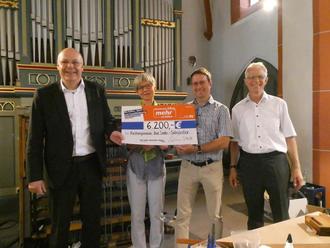 Das Crowdfunding-Projekt „Ohrwurm statt Holzwurm – damit die Orgel wieder klingt“ der Evangelischen Kirchengemeinde Bad Soden-Salmünster ist erfolgreich zu Ende gegangen. Norbert Ross, Direktor der VR-Bank-Main-Kinzig-Büdingen eG, übergab auf der Orgelempore der Ratzmannorgel einen Spendenscheck der Bank in Höhe von 6.200 Euro an Pfarrer Fredy Henning, den Kirchenvorstandsvorsitzenden Dr. Tobias Bausch und Kirchenvorstandsmitglied Ulrike Reichenbach.