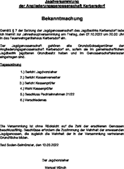 Gemäß § 7 der Satzung der Jagdgenossenschaft des Jagdbezirks Kerbersdorf lade ich hiermit zur Jahreshauptversammlung am Freitag, den 07.10.2022 um 20.00 Uhr in das Feuerwehrgerätehaus Kerbersdorf ein.