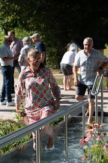 Stadträtin Birgit Enders-Jacob (vorne) und Hans-Georg Schießer testen die neue Wassertretanlage