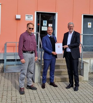 Von rechts nach links: Digitalstaatssekretär Patrick Burghardt (rechts) überreicht den Förderbescheid für ein neues Trägerfahrzeug an Bürgermeister Dominik Brasch und Bauhofleiter Christoph Betz.