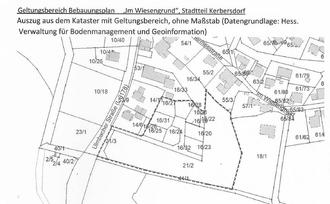 Die Stadtverordnetenversammlung der Stadt Bad Soden-Salmünster hat am 11.12.2023 in öffentlicher Sitzung gemäß § 2 Abs. 1 BauGB in Verbindung mit § 5 HGO die Aufstellung eines Bebauungsplanes für den Bereich „Im Wiesengrund“ im Stadtteil Kerbersdorf beschlossen.