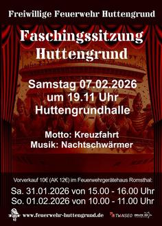 es ist wieder soweit, wir feiern die 5. Jahreszeit. Am Samstag, den 07.02.2026 findet wieder die öffentliche Faschingssitzung der Freiwilligen Feuerwehr Huttengrund e.V. in der Huttengrundhalle in Bad Soden Samünster- Ortsteil Romsthal statt. Einlass ist ab 18:11 Uhr, Beginn ist um 19:11 Uhr. Das bunte Programm beinhaltet Garde- und Showtänze, Sketche und Büttenreden.