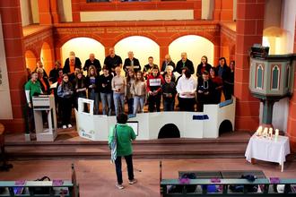 Mit einer, auch durch die Sommerferien, recht kurzen Anlaufzeit übten die Aktiven des Liederkranzes das Stück parallel zu den Konfirmandinnen und Konfirmanden ein. Einer ersten gemeinsamen Probe im Sängerheim und der Generalprobe in der Versöhnungskirche zu Salmünster folgte am nächsten Tag am selben Ort schließlich die Aufführung. Zusätzlich bot der Familienchor mit „Dem, der die Liebe ist“ und „Sei behütet“ noch zwei weitere Stücke im Rahmen des gut besuchten Gottesdienstes dar. Aufgrund kurzfristiger Ausfälle übernahm Annette Bötel-Kehl, Leiterin des Männerchores, gewohnt souverän das Dirigat. [Bx]