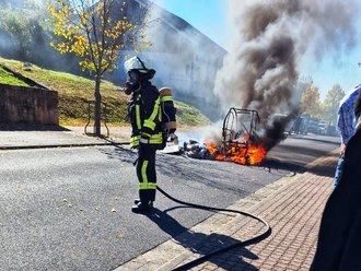 Die Feuerwehr Salmünster wurde am Sonntag, 9. Oktober 2022 um 13:38 Uhr zum Brand eines E-Kabinenrollers in einem Salmünsterer Wohngebiet alarmiert. Auf der Straße stand ein elektrobetriebenes Kleinfahrzeug mit Zeitungen im Vollbrand. Durch die große Hitzeentwicklung wurde auch bereits die Hecke eines benachbarten Wohnhauses und ein Müllbehälter angesengt. Außerdem gab es eine große Rauchentwicklung, so dass die Anwohner gebeten wurden, Fenster und Türen geschlossen zu halten.